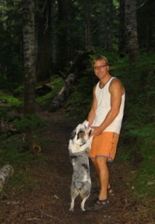Owner inventor Richard Parups with his dog Mic enjoying a trail on Mount St. Hellens |